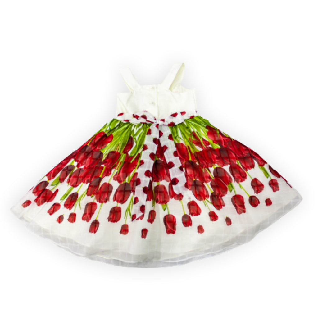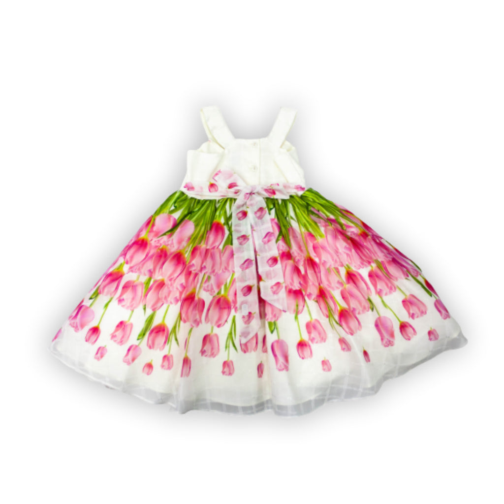Vestido para niña con estampados de flores y adorno en la cintura. Contiene cartera unicolor y detalle de lazo.
