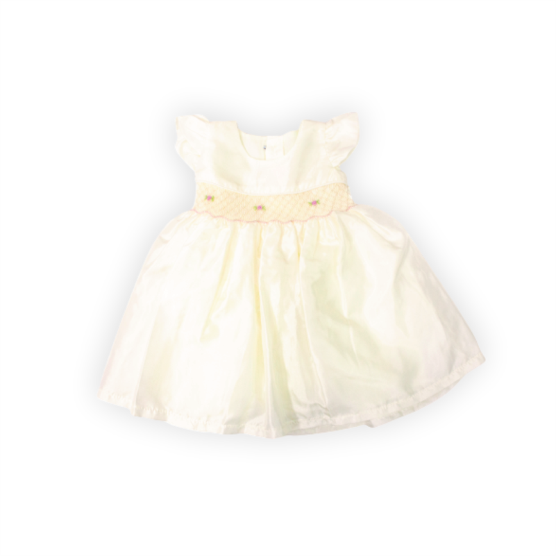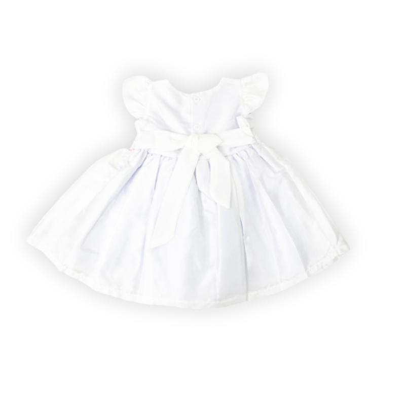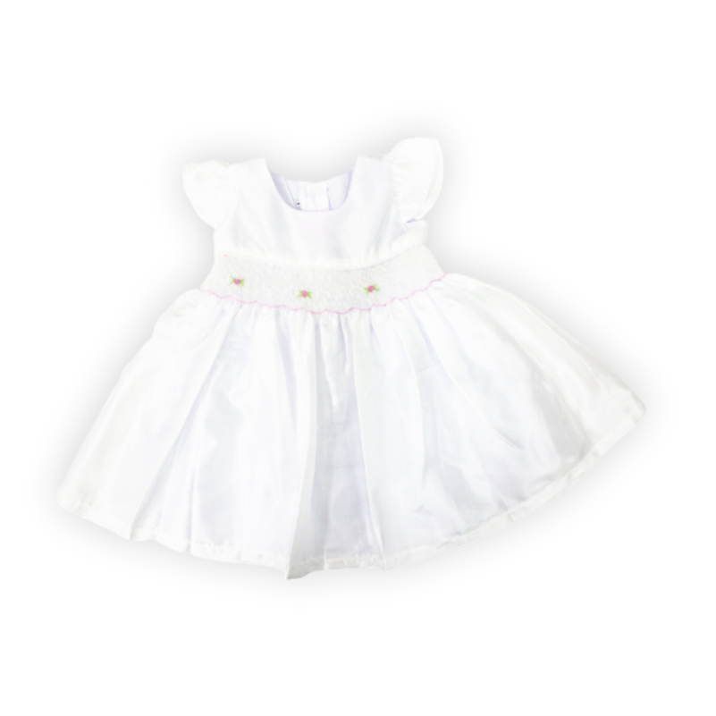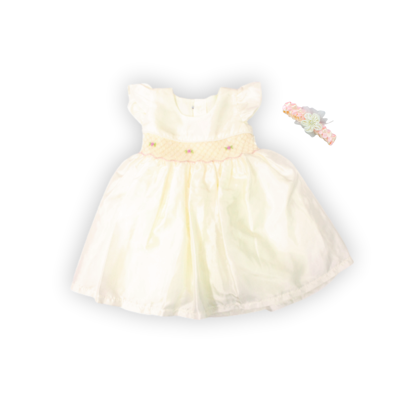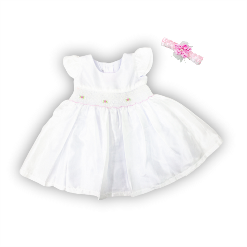 Vestido bautizo, manga corta con detalle de pequeñas flores en la cintura. Contiene cintillo.