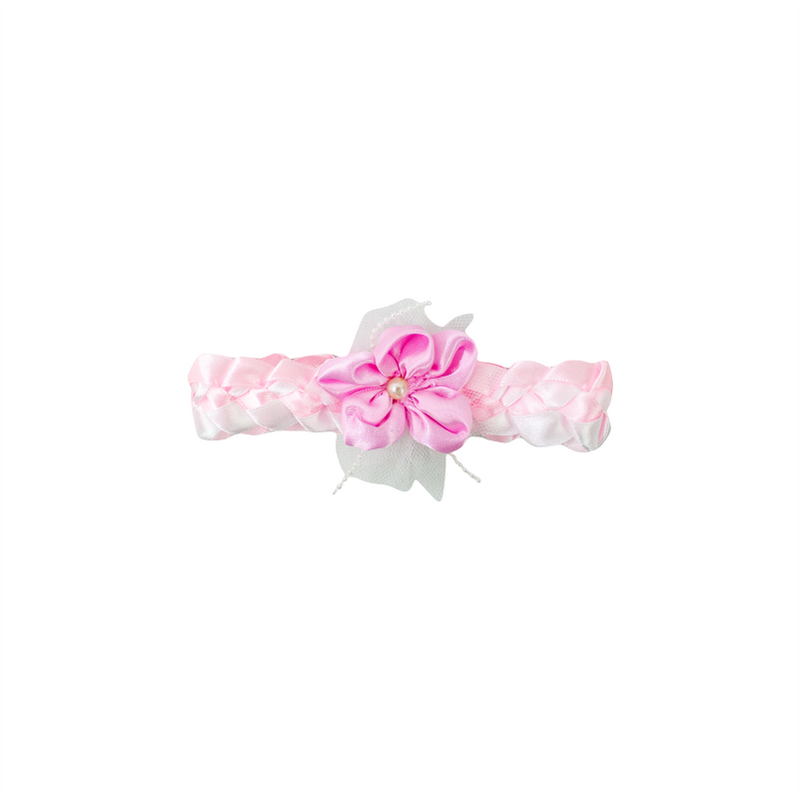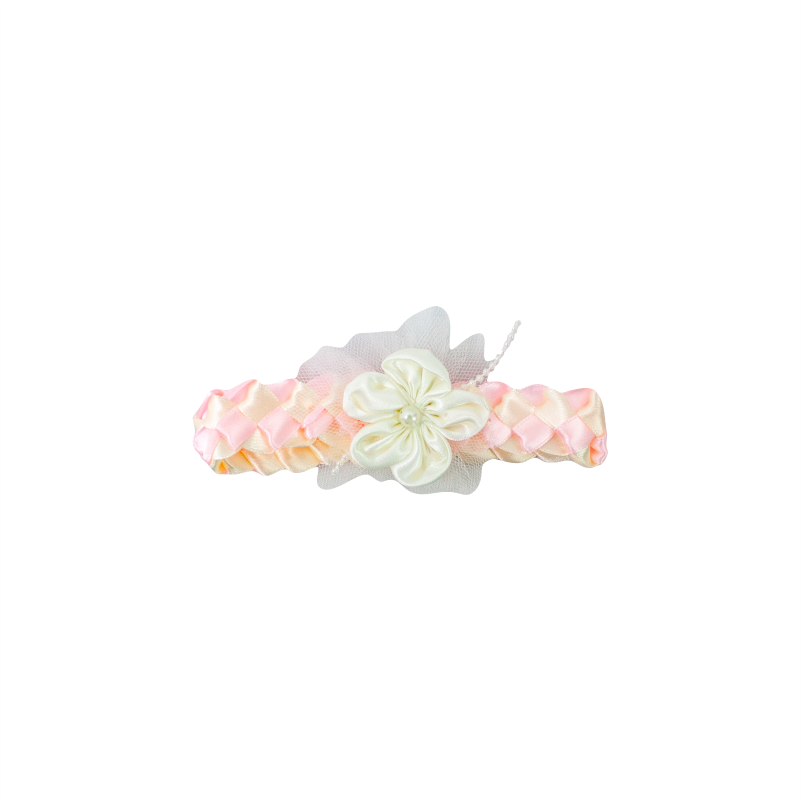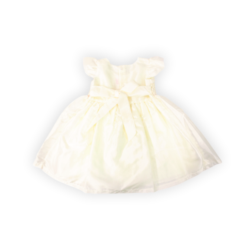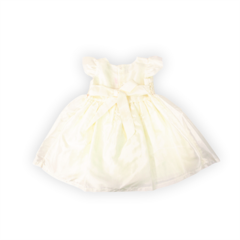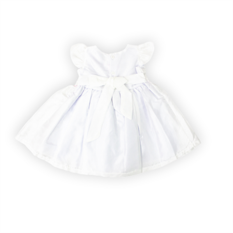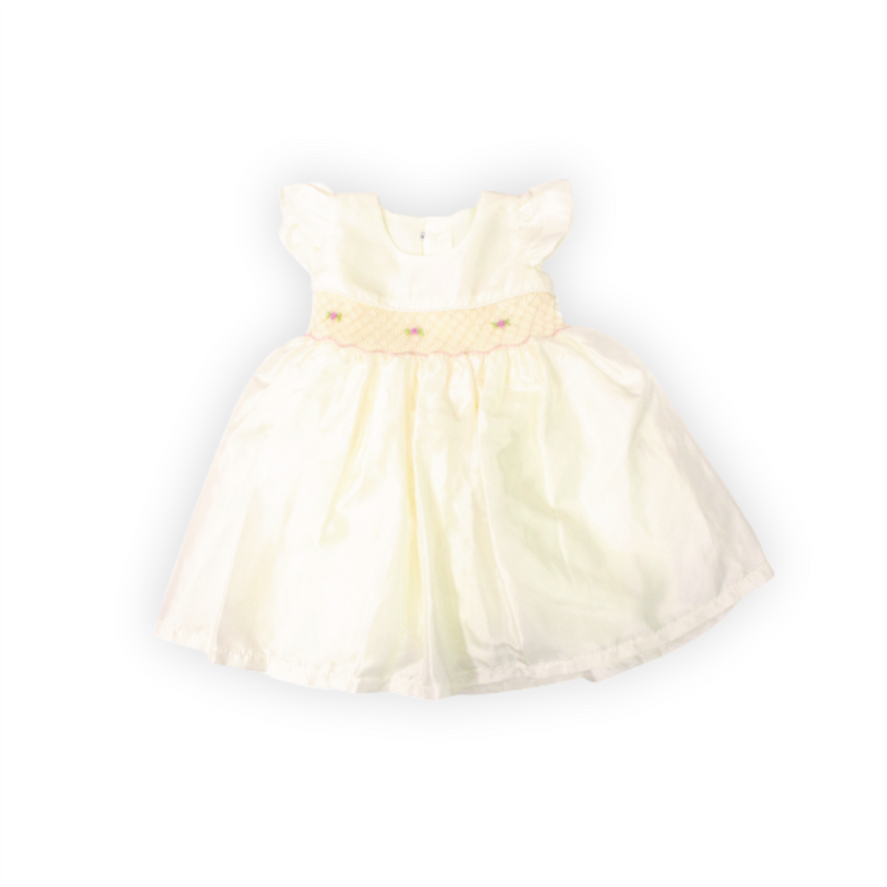 Vestido bautizo, manga corta con detalle de pequeñas flores en la cintura. Contiene cintillo.