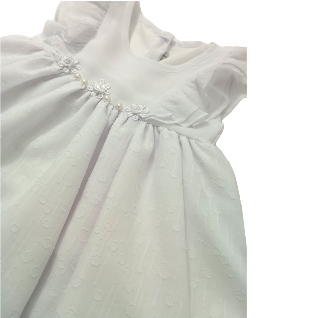 Vestido bautizo blanco con detalles decorativos y elementos de adorno, manga corta. Contiene panty.