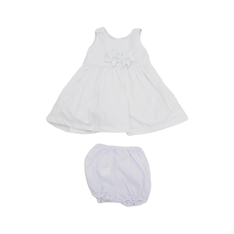 Vestido bautizo blanco con detalles decorativos y elementos de adorno, manga corta. Contiene panty.