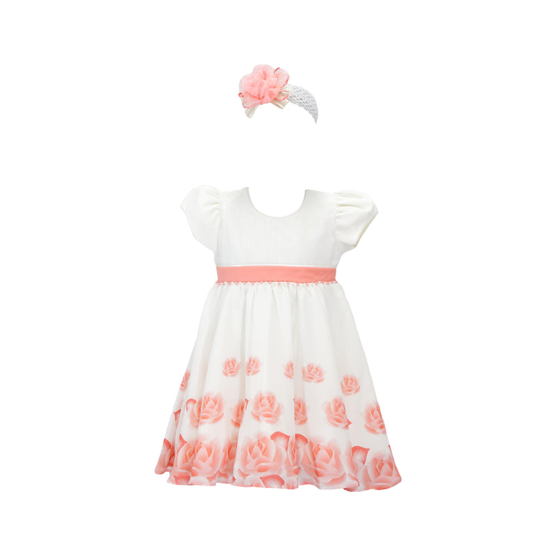 Vestido estampado de flores con detalles decorativos y elementos de adorno, estilo boleros en el pecho. Contiene viancha para el cabello.