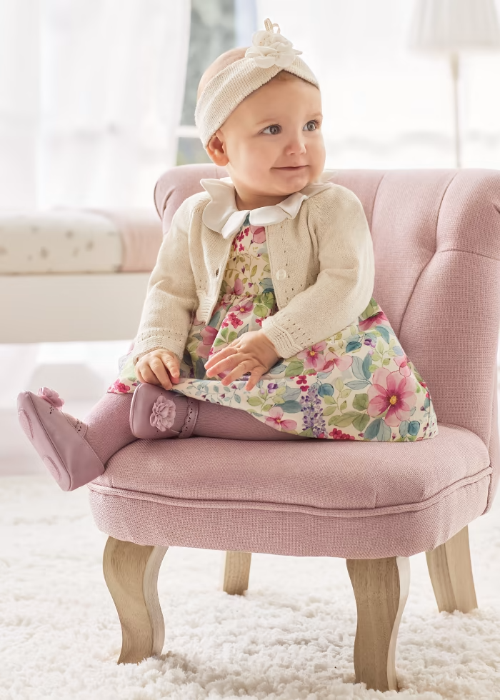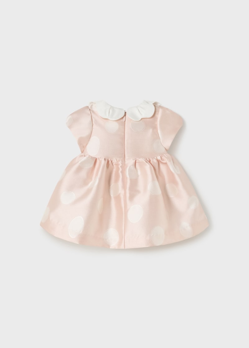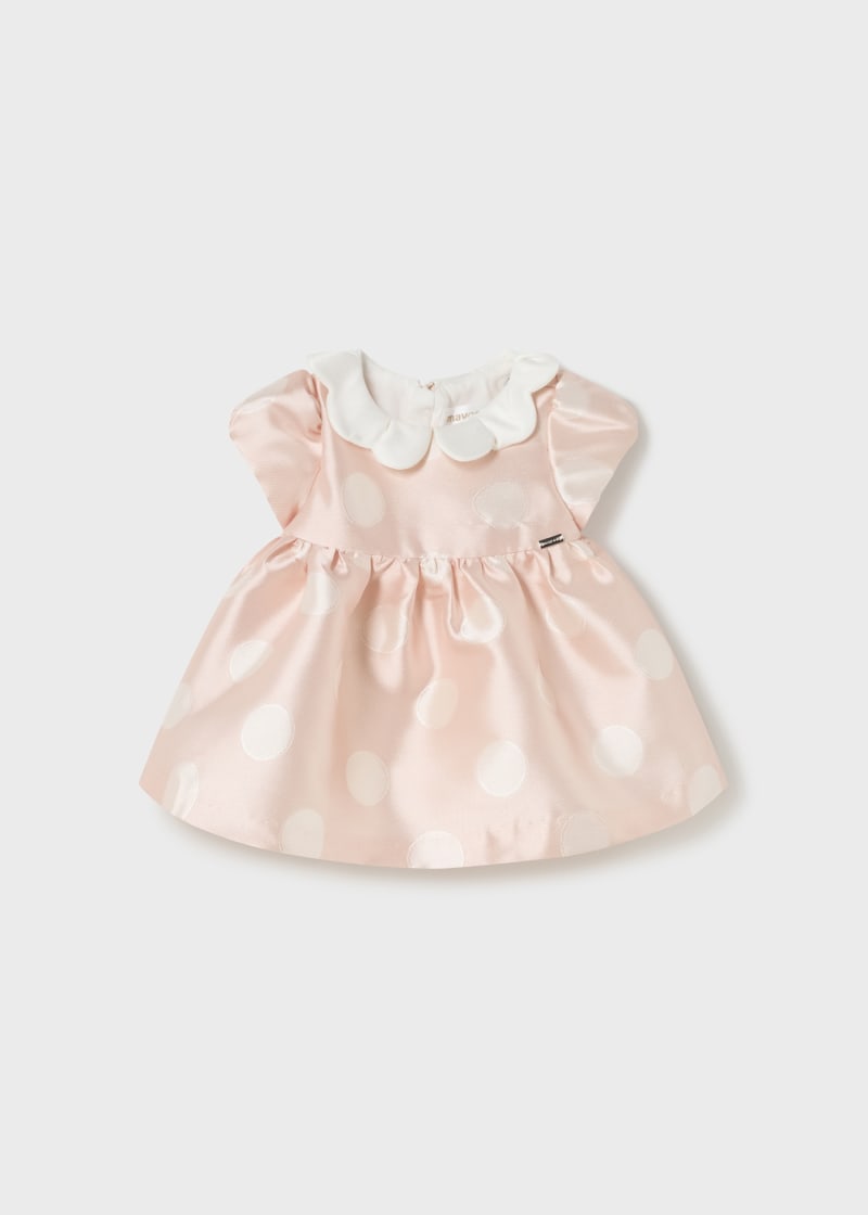 Vestido con mangas cortas para recién nacido. Cierre invisible en su espalda para facilitar la puesta de la prenda. Diseño estampado. Modelo perteneciente a nuestra línea más elegante y exclusiva pensada para vestir a los más pequeños en las ocasiones más especiales.