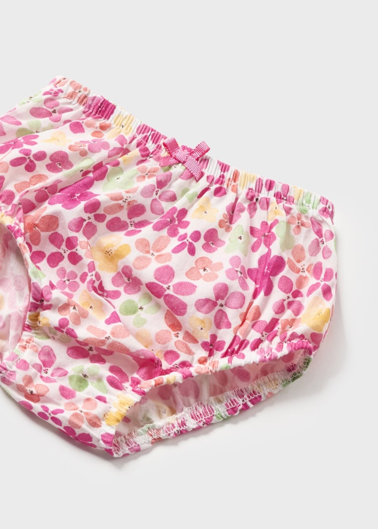 Conjunto de dos piezas para recién nacido formado por un vestido con braguitas a juego. Vestido sin mangas para recién nacido. Cierre con botones en la espalda para facilitar la puesta de la prenda. Tejido 100% algodón. Diseño estampado.