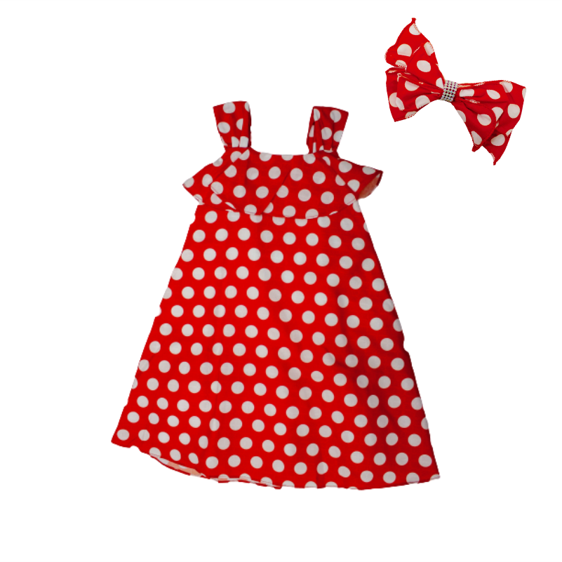 Vestido para niña con estampados de puntos y detalle de lazo en el frente, que harán lucir a tu pequeña mucho más bella. Contiene hermoso gancho para cabello.