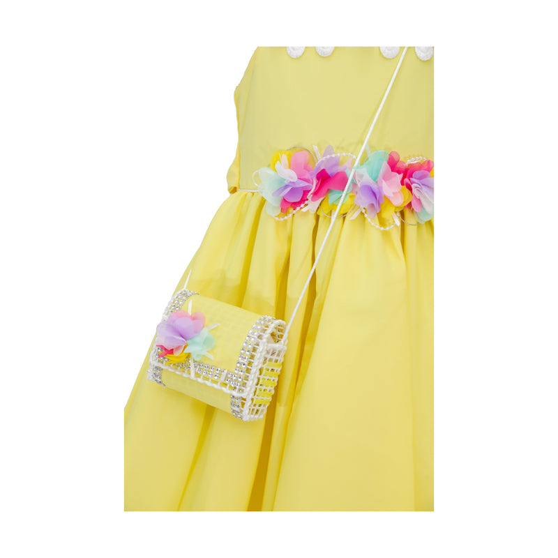 Vestido para niña unicolor con detalles decorativos en el frente. Contiene hermoso bolso unicolor.